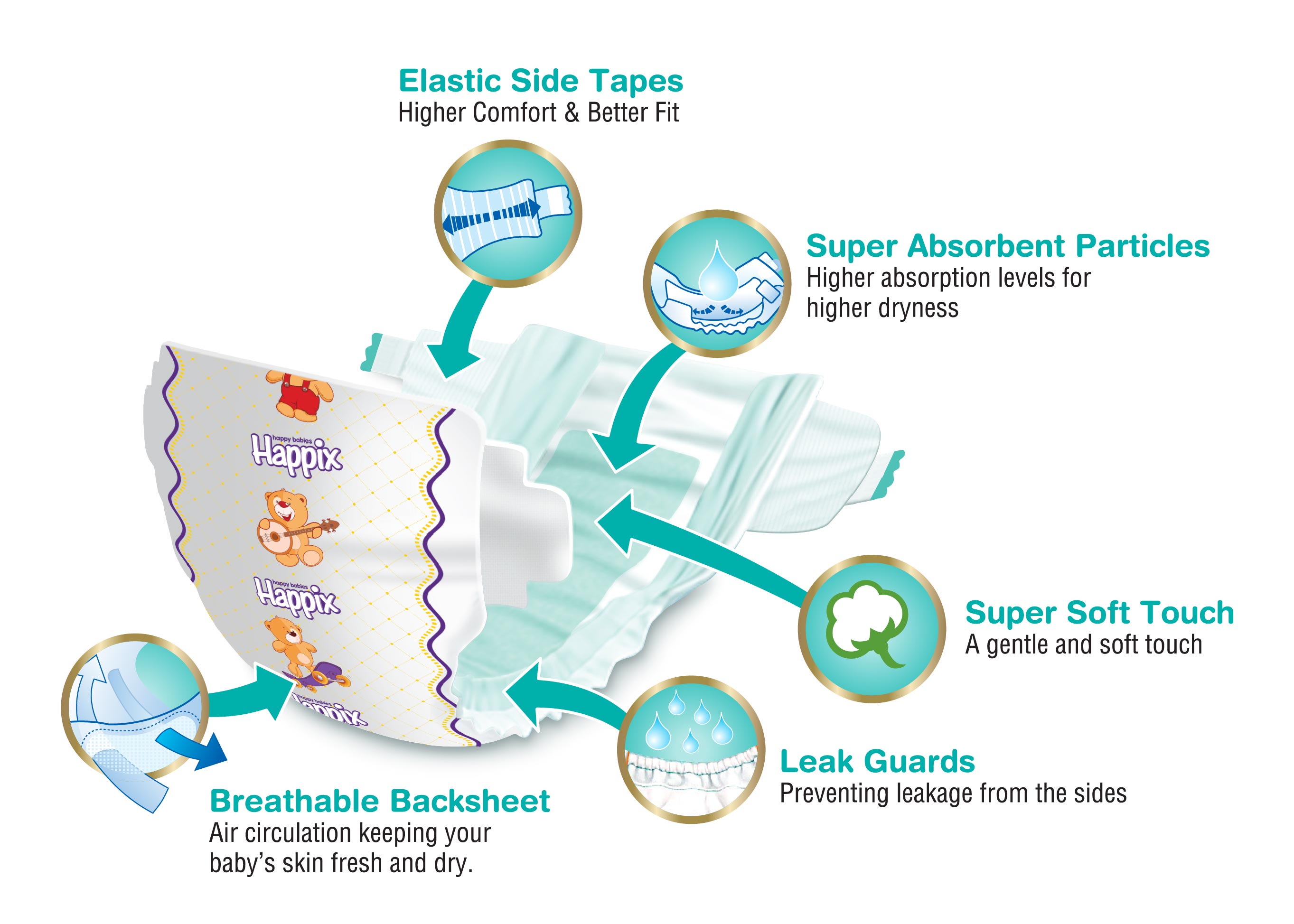 Happix has a breathable top surface that allows fresh air to give comfort for your baby's skin and helps preventing nappy rash.