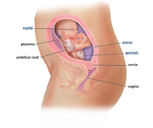 Your baby's skin is being increasingly covered by vernix. This is a thick, white, greasy cream that protects their skin in their watery environment. Vernix disappears by about 40 weeks, but if your baby is born at 39 weeks or less, you will notice it is still on their skin. Your baby's eyelids are still fused shut but the retinas of their eyes are fully developed and they now have distinct eyelashes and eyebrows. Your baby's hair follicles are now pigmenting to give them hair colour, looking dark, fair or red!